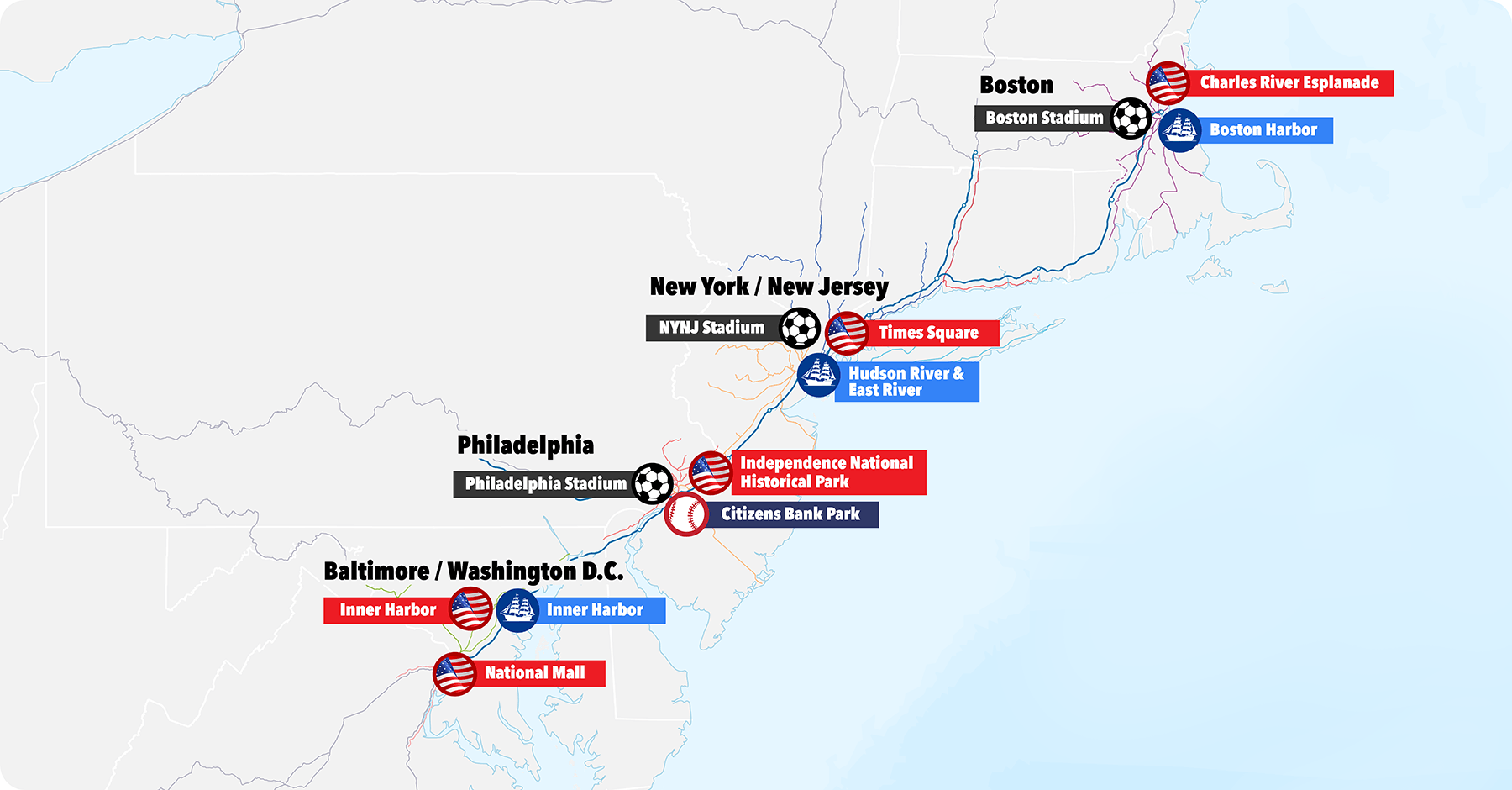 The world’s premier international soccer/football tournament, with 21 matches (including the final) taking place in the Northeast U.S.